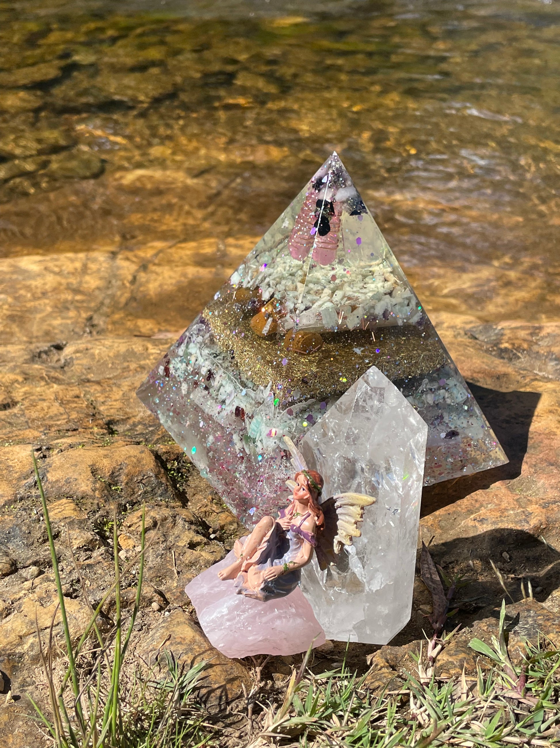 This large Pyramid Orgonite is inspired by the Atlantis fae. It carries the energy of otherworld manifesting hope, joy, beauty, magic, flow, love and elemental healing.