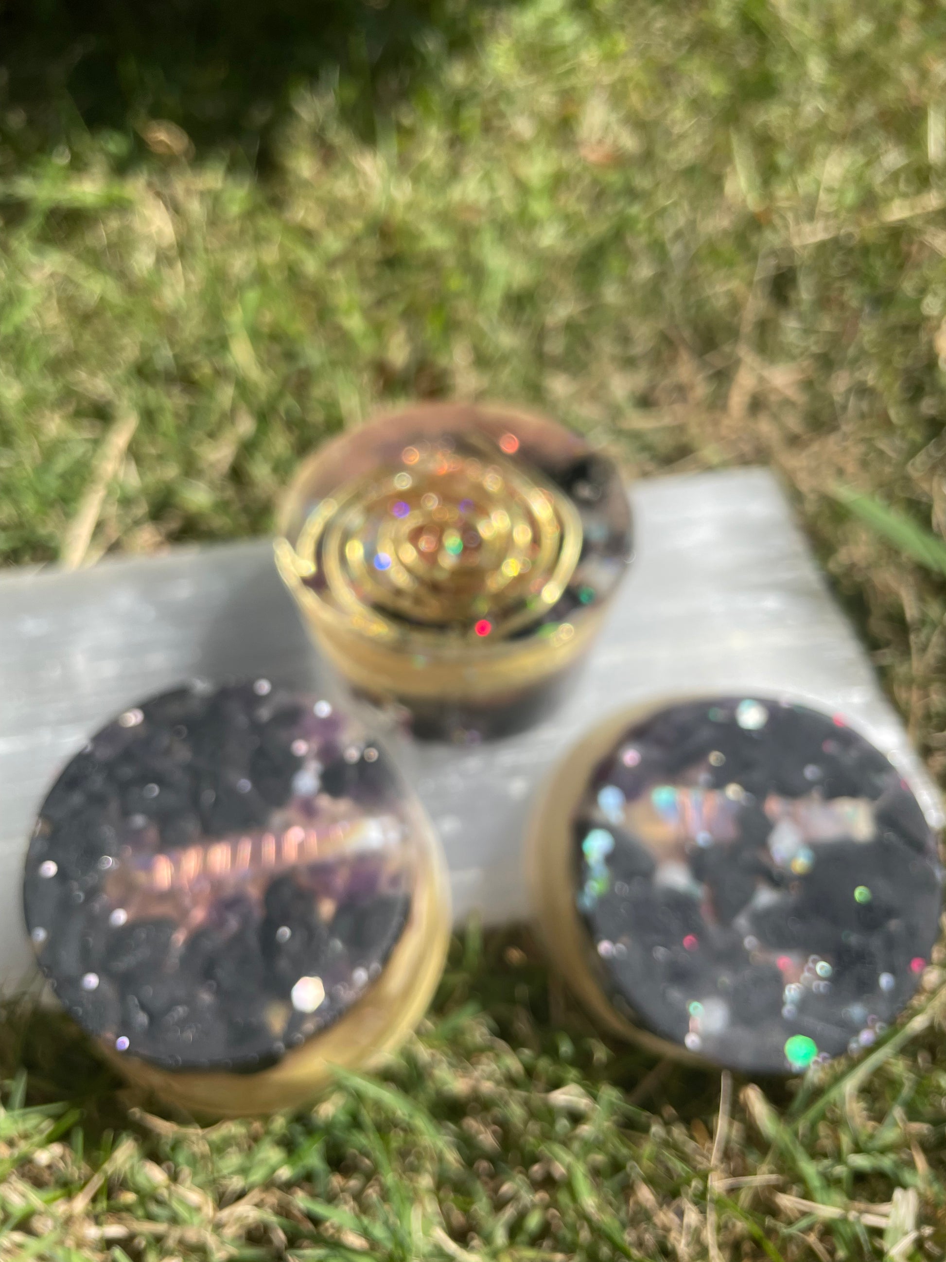 This Tower buster orgonite is a powerful protective generator of life force energy, clearing your environment. It contains Shungite, Amethyst, Angel Aura Quartz, Black Tourmaline and Moonstone, copper and galactic sparkles.