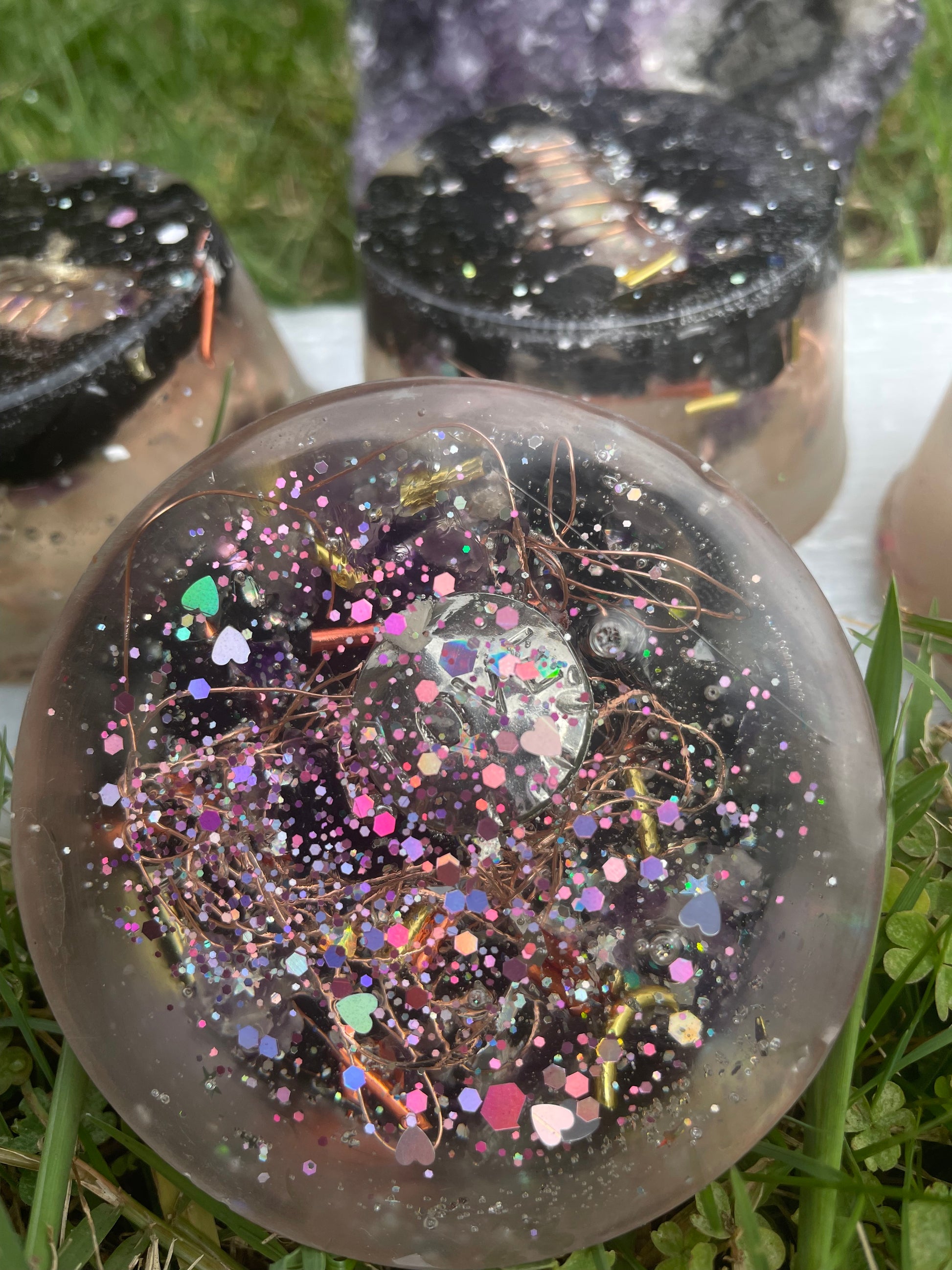 Sale item. This Tower buster orgonite is a powerful protective generator of life force energy, clearing your environment. It contains Shungite, Amethyst, Angel Aura Quartz, Black Tourmaline, copper and galactic sparkles.
