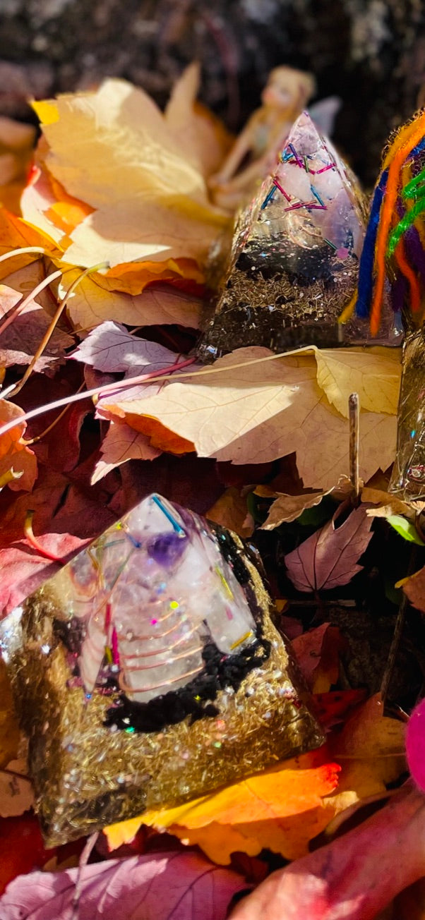 Crystals used are Selenite, Amethyst, Shungite, Rose quartz, clear Quartz, Angel aura quartz. Mixed metals, copper and sparkles of unicorn magic dust.